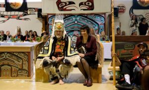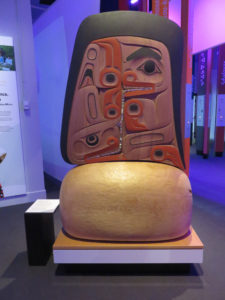 Storytellers and Language Keepers (2014), on exhibit at the Royal British Columbia Museum in Victoria, is quite distinct from Jaalen’s other larger works in that it takes a unique form: the red cedar sculpture is in the shape of a six foot tall Haida designed ear. The design within the ear shape is a tribute to women’s role in passing on Xaad Kil/Xaayda Kil, the Haida language, to the next generation over thousands of years. It is at the RBCM as part of the Our Living Languages: First Peoples’ Voices in B.C. exhibit that explores all the First Nations languages across BC and the impact colonialism has had on their survival.