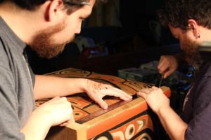 Jaalen has three major carved pieces (alongside his poles) that are being exhibited in Museums. The Gidansda Settee (2017) and the Great Box Considered (2015) are both being exhibited at the Haida Gwaii Museum at Kay Llnagaay in Skidegate. You can find out more about the Great Box Project and link to more resources here, and the read story of the Gidansda Settee here.