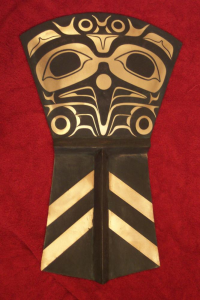 Jaalen’s shields are hand beaten in copper for a high quality result that reflects a long tradition of the craft among Haida people. He was named Copper Maker for the Ts’aahl Eagle Clan of Skidegate, smithing the shields that represent wealth for his people. For the Haida, copper shields bear witness to their history and culture. The shields are displayed at potlatches and accompany the clans as adoptions, agreements and celebrations take place. As stories are told and songs and dances are performed all these happenings are put into the shields. The rights to sing a song or tell a story are held by the shield and go with it should it be gifted to another chief. As such, the copper shields accrue value or wealth as they witness a clan’s history and gain rights through time.